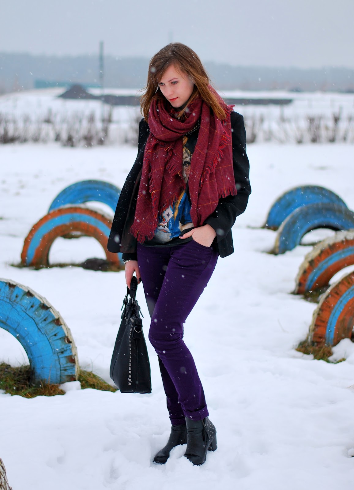 I recently remembered that I own purple jeans. Love this deep purple color. I combined them with my super warm bordo scarf and CAT t-shirt, that I bought on sales.